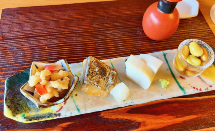 前菜は、鱧の南蛮漬けに 焼きものは鰆。板わさ、青大豆の煮浸し。