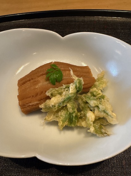 揚物 は、ふきのとう、穴子飯蒸し ( いいむし )